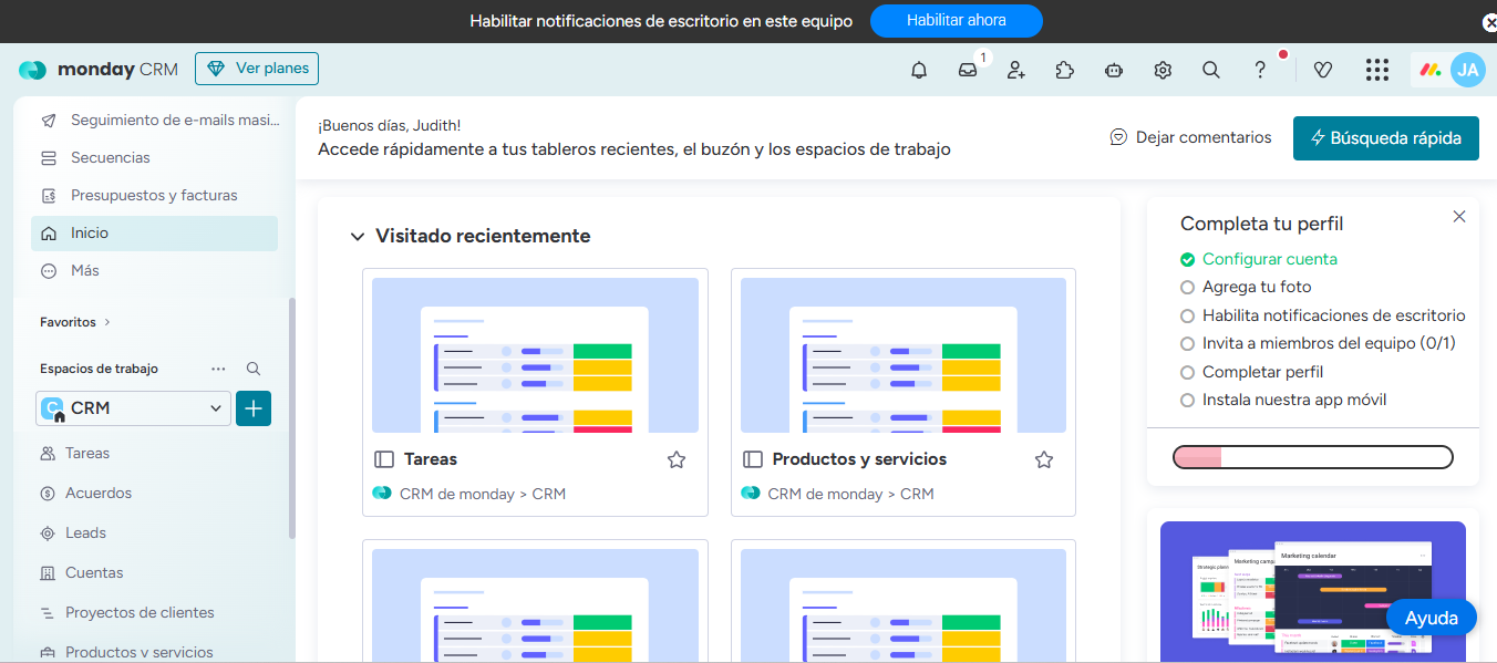El plan gratuito de monday.com ofrece una solución sencilla para equipos que inician en la gestión CRM con un enfoque visual y fácil configuración. Normalmente, es apropiado para proyectos pequeños y pruebas, pero para funcionalidades avanzadas y mayor escalabilidad es necesario migrar a planes pagos.